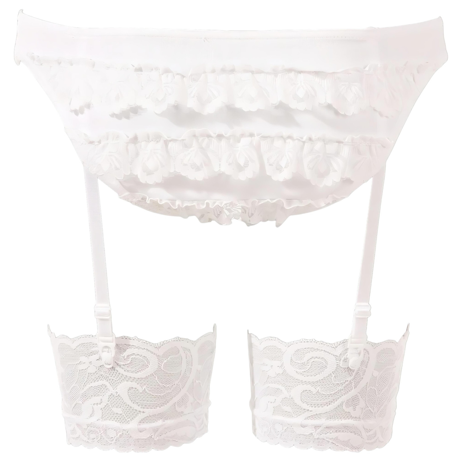 • Бикини с жартиери и воланчета: Еластична материя, украсени с дантелена гарнитура отзад, четири регулируеми ленти за жартиери за перфектно прилягане.